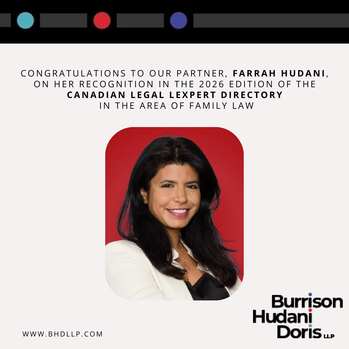 Congratulations to our partner, Farrah Hudani, on her recognition in the 2026 edition of the Canadian Legal Expert Directory in the area of family law.